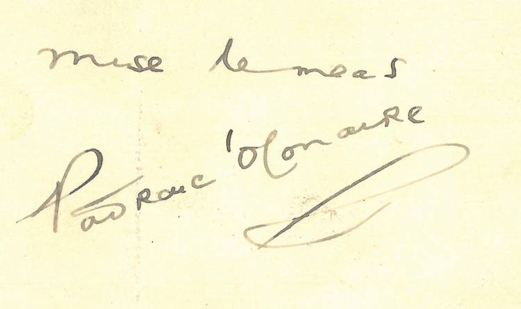The preserved signature of Pádraic Ó Conaire (photo courtesy Galway City Museum, Ireland)