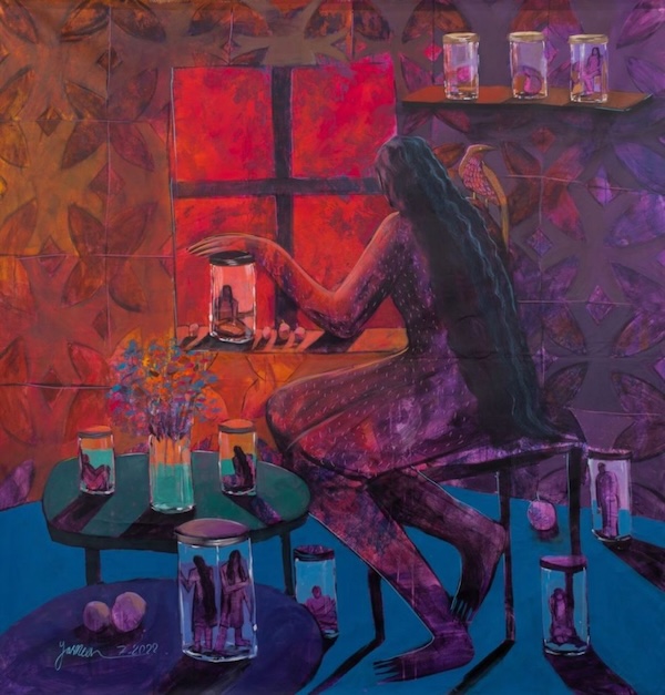 Saeed’s painting style eludes easy definition. Describing her work as figurative is both accurate yet inadequate. While figures are central to each painting, they are marked by anonymity, reflecting a symbolic narrative referring obliquely to enemy soldiers usurping homes, the fears of impending loss and, in the haunting work Memory Is a Sealed Box Only Opened by Longing, dreams of safety and peace.