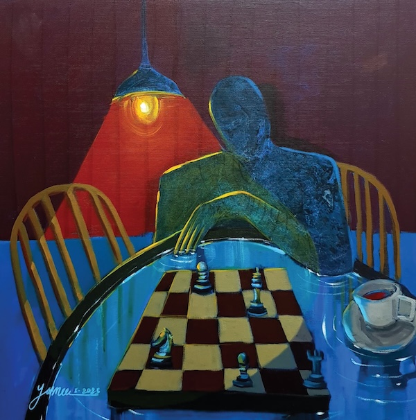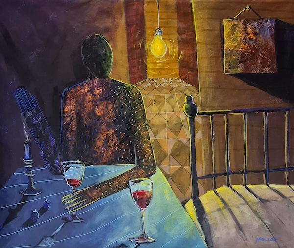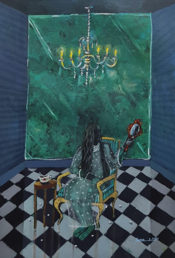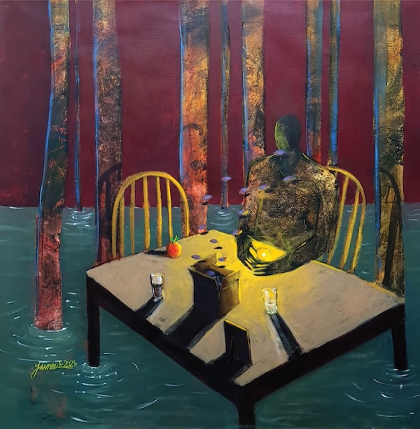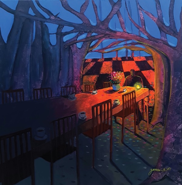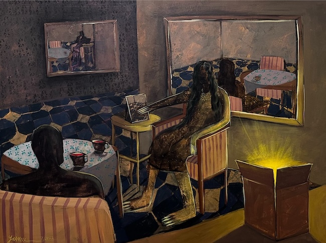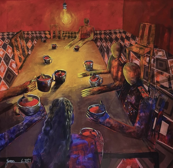 The light in Saeed’s paintings is not the atmospheric light of more traditional painting. It is neither warm nor enveloping. Rather, a harsh luminosity anchors each work—an unnatural light that illuminates the scenes as if we were watching a play unfold with unfamiliar characters signaling their story. Saeed’s interest in women’s issues and the elusive interiority of women and young girls caught in the web of wartime is reflected in two paintings: They Put Me in a Pot and Told Me To Adapt and the sad lament of There Is No Secret in My Body at Night Except What I Waited for and What I Lost. Both paintings convey through an eerie dark palette and sharp linear drawing, the longing and sorrow of being stuck in circumstances beyond one’s control. The embedded feminist cries within these titles are evident—in different ways than men, women endure a particular dislocation and pain from the fallout of civil war. Saeed told me that furniture in her paintings—chairs, tables, beds— symbolize a witnessing to history both personal and universal. Material objects containing truths that may never come to light.