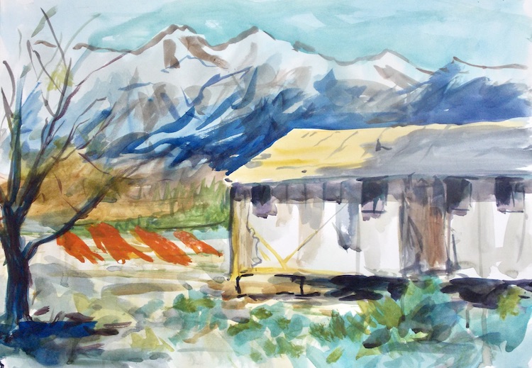 There is quiet poetry in his paintings of Manzanar, one of the most infamous of the internment camps that forcibly held Japanese Americans during World War II. Manzanar, like other camps scattered across the western US, was in a barren and remote location, and the conditions were described by survivors as “prison-like.” Hero’s work captures the harshness of life, the feeling of isolation, and the sense of displacement that detainees must have felt. Yet he also documents hints of life, hope, and resilience in the purple hues of the horizon and the bright reds of laundry on the line.