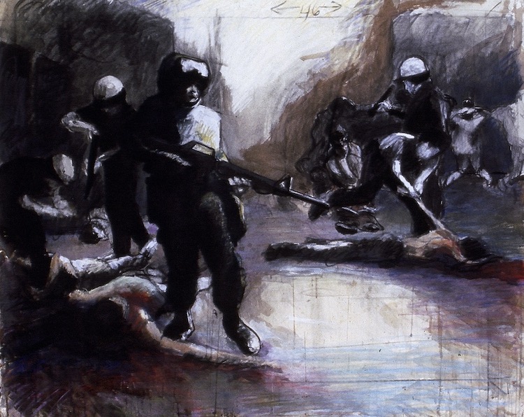 Consistency is the hallmark of a well-developed body of work and this is precisely what we see from Chris Hero. While he is adept at many mediums, including watercolors, oils, and acrylics, he views the problem of medium as a “logistical issue, not an artistic one.” The materials are secondary to the message, which always rings loud and clear: How nations, near and far, inflict harm on minority communities.