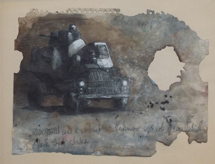 In South African Rhino we see the outlines of sketchbook paper hurriedly torn from its notebook, with frayed edges and a mottled palette of grays and browns with hints of pink and blue dancing in the background. The title invites you to interrogate the way militarized vehicles became an ever-present, almost naturalized part of the South African landscape under apartheid.