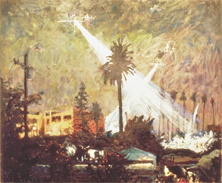The theme of state-sanctioned violence, surveillance, and control is on full display in the paintings Night Time Street Show and Night Show Venice. In the same way that the rhino symbolized the familiarity of oppression in South Africa, the always-hovering helicopters above urban California watch ceaselessly as a way to remind the marginalized of their outcast status.