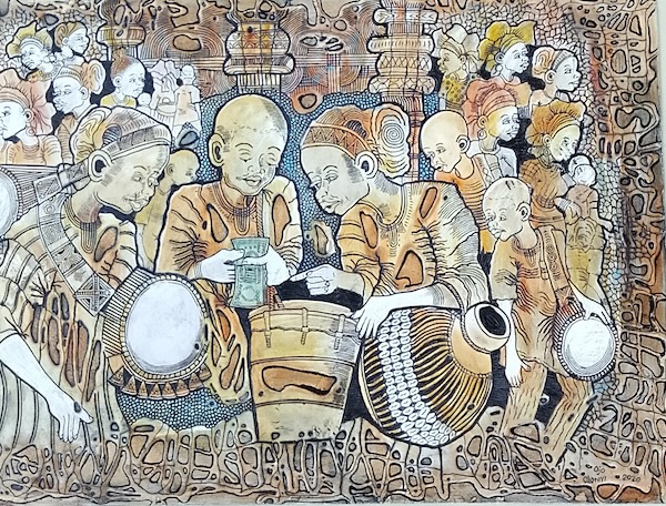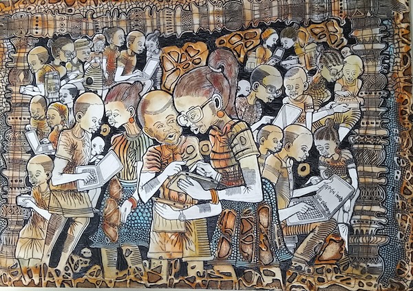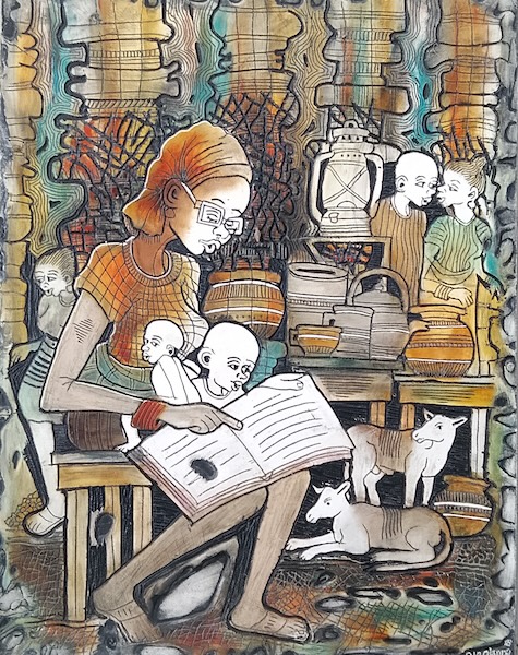 The work of Ojo Olaniyi reflects a richly decorated narrative style depicting everyday scenes in the kaleidoscope of Nigerian life. Olaniyi’s art comprises vignettes of social and commercial life in a technique known as epoxy etching. While each image relates to a particular action of daily life—teaching a child, buying fish at a market, or engaging in money matters—a swirl of graphic decoration is embedded in each print creating a density of pattern and linear description.